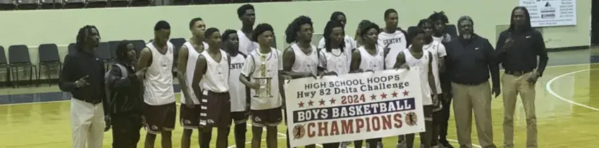 The Rams of Gentry High recently won the Highway 82 Delta Challenge tournament. From left to right front row: Kilpatrick Sibley, Tyquevious Attaway, Draven Walker (MVP of tournament), Kylan Appleberry, Caleb Johnson, Emaun Price, JeKobe Bell, JeCorvin Little (Duke), Assistant Coach Shomari Davis and Quincy Davis.