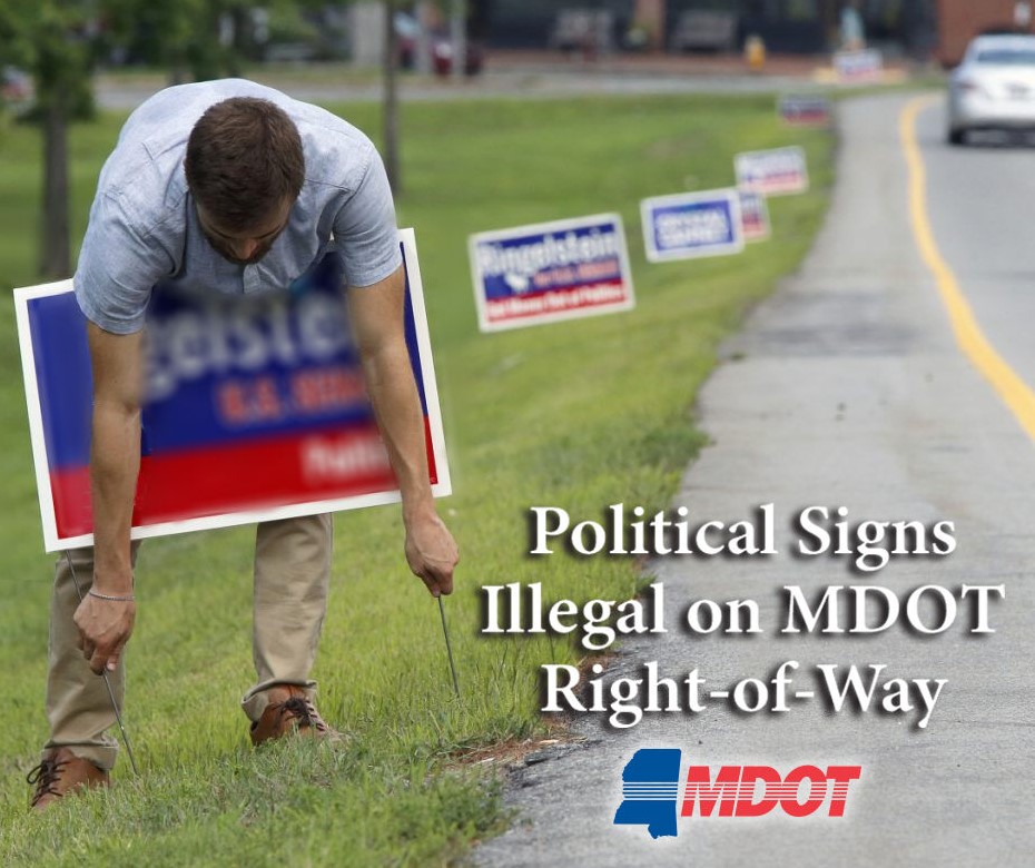 The Mississippi Department of Transportation (MDOT) reminds political candidates that campaign signs are not permitted within right-of-way on state highways according to Section 63-3-317 of the Mississippi Code of 1972 Annotated. The width of highway right-of-way varies by location and includes the driving lanes, shoulders and mowed areas; the right-of-way can potentially reach distances of 300 feet or more from the centerline of driving lanes.