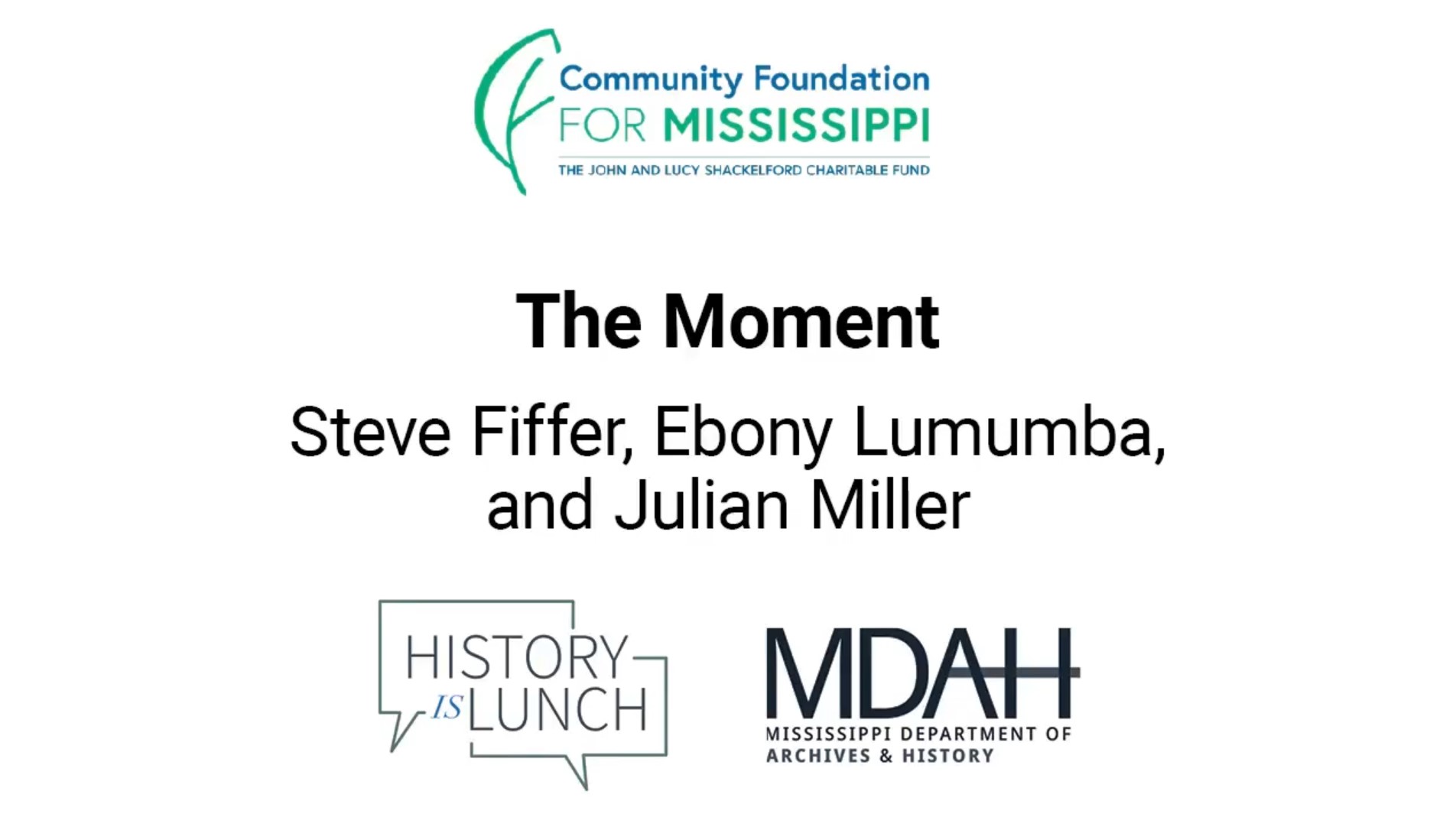 History Is Lunch is sponsored by the John and Lucy Shackelford Charitable Fund of the Community Foundation for Mississippi. The weekly lecture series of the Mississippi Department of Archives and History explores different aspects of the state's past. The hour-long programs are held in the Craig H. Neilsen Auditorium of the Museum of Mississippi History and Mississippi Civil Rights Museum building at 222 North Street in Jackson and livestreamed on YouTube and Facebook.
