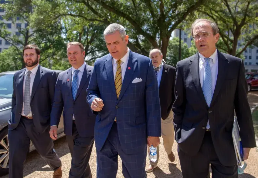 Mississippi House speaker Philip Gunn, center, and Lt. Gov. Delbert Hosemann, right, talk after Gov. Tate Reeves press conference at the State of Mississippi Woolfolk Building in Jackson, Miss., Thursday, May 7, 2020. Credit: Eric J. Shelton/Mississippi Today