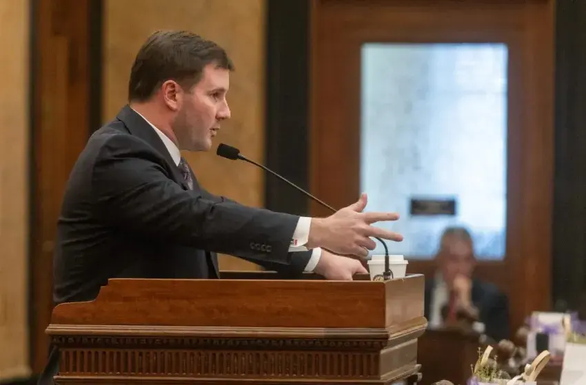 Trey Lamar, R-Senatobia, speaks to lawmakers at the State Capitol in Jackson, Miss., Thursday, Jan. 18, 2024, during a special legislative session called by Gov. Tate Reeves to approve an economic development project in North Mississippi. Credit: Eric J. Shelton/Mississippi Today