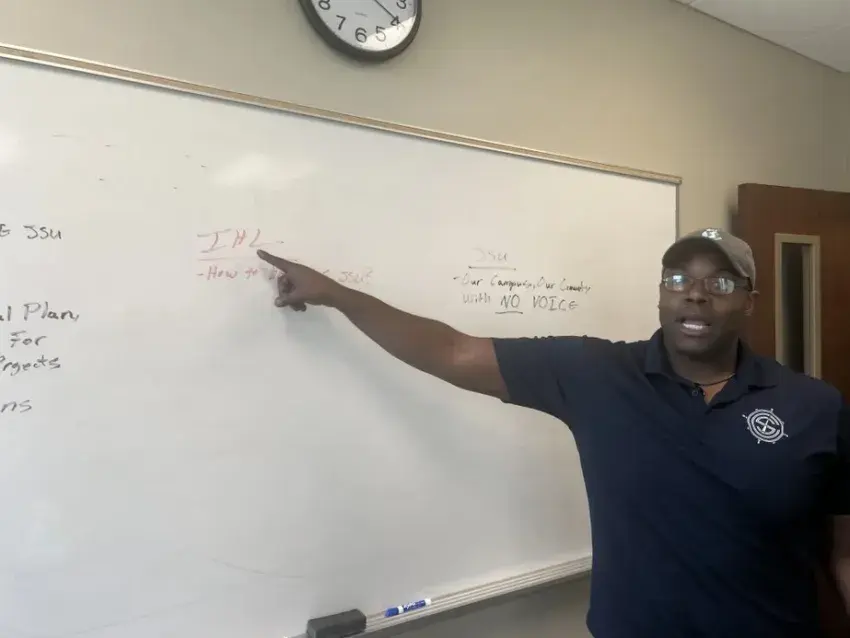 William Brown and Millard Bingham, standing with their arms crossed, are waiting in a hallway of classrooms for the executive session to end, hoping it’ll bring some information about who is going to be the next president of Jackson State University.