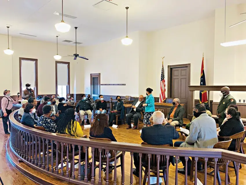 U.S. Secretary of the Interior Deb Haaland, standing just to the left of the American flag, is flanked by Congressman Bennie Thompson, seated to her left, and Rev. Wheeler Parker, seated to her right, during a Tuesday meeting in the courtroom of the Tallahatchie County Courthouse in Sumner to discuss formation of a national park. (Photo submitted)