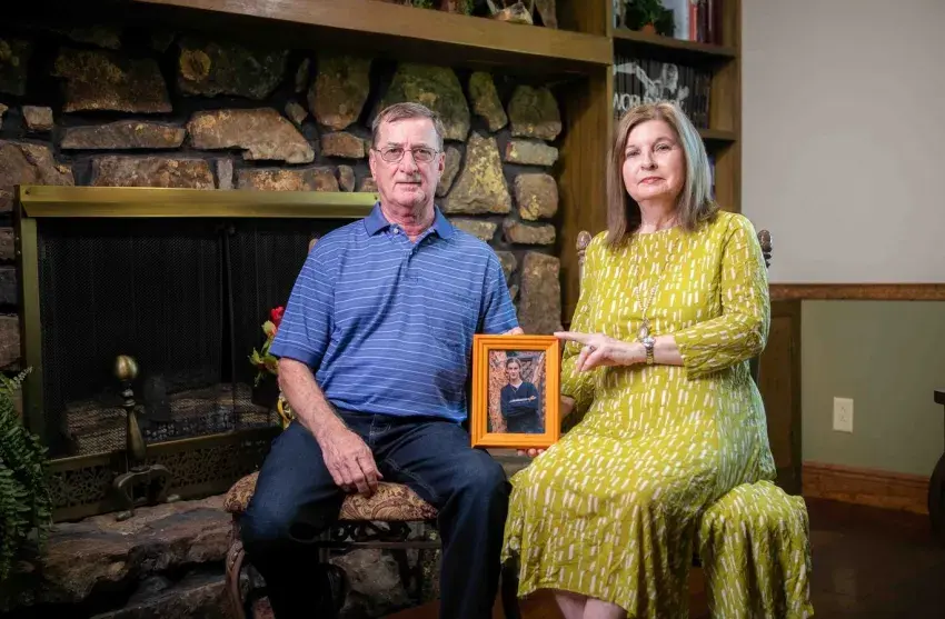 George and Dianne Sellers, seen here in their Quitman, Mississippi, home in April 2022, hold a photo of their son, Brad, who has been in and out of mental health facilities. Brad Sellers, 40, is diagnosed with schizophrenia and is charged with assault on a police officer. A psychiatrist has determined he’s incompetent to stand trial but could be restored to competency. Blair Parker Ballou/MCIR