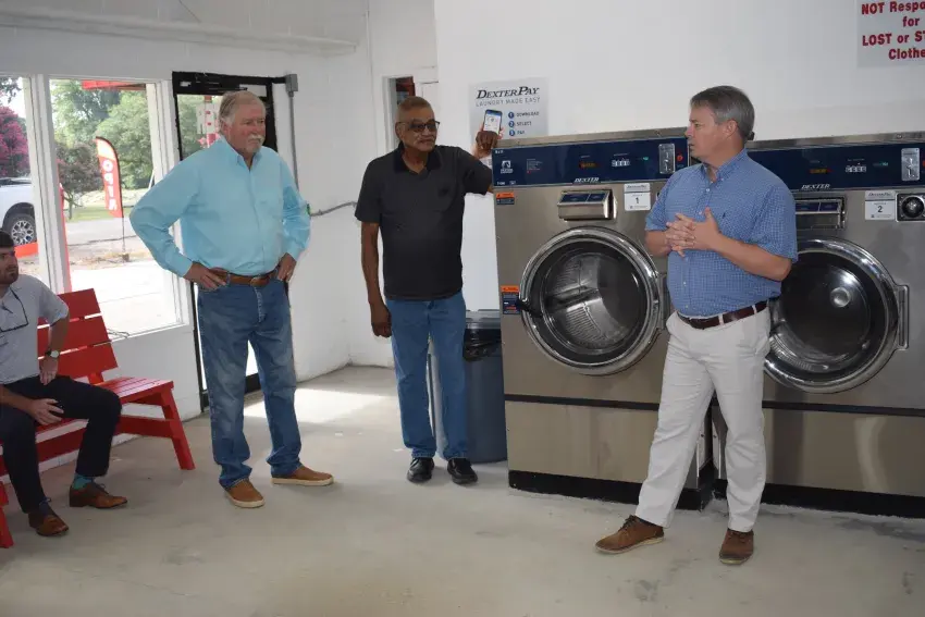 Jim Aycock (far right) gives a speech to a gathering of local people at the grand opening of Filler Up Coin Operated Labdromat, Inverness' first such business in the last ten years. Also in attendance were (left to right) Mayor David Smith and Vice Mayor Henry Sibley.