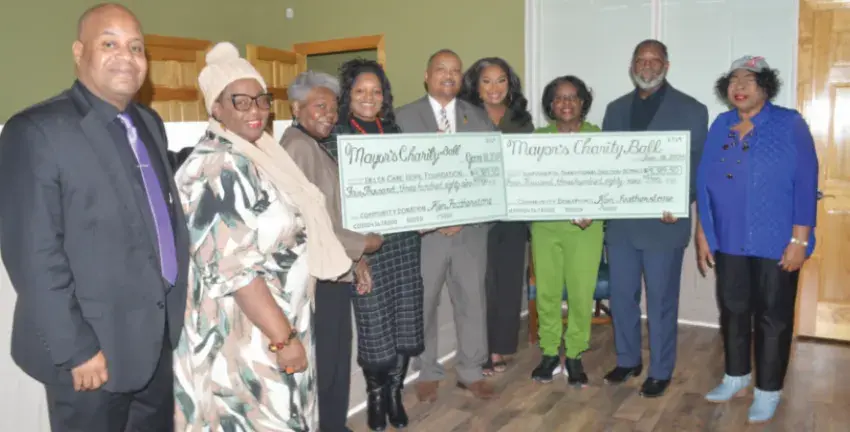 Hundreds of people showed up two weeks ago to the third annual Indianola Mayor’s Charity Ball. Held at the National Guard Armory building, the event featured local musical talent, local cuisine and two organizations that have received the proceeds from the event’s ticket sales. Pictured above, surrounded by community members, Mayor Ken Featherstone and First Lady Cheryl Featherstone, are representatives from recipient organizations Delta Care Hope Foundation and the Sunflower County Transitional Shelter for the Homeless, operated by Sunflower County Ministerial Alliance Counseling Services.