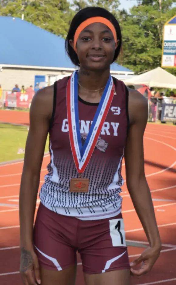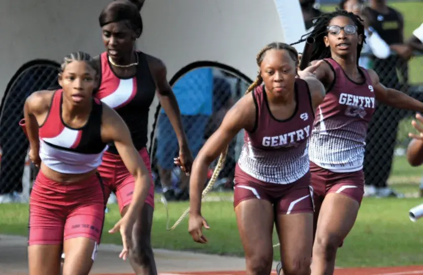 Mykila Minor makes a jump in the 300 meter hurdle. Minor finished 3rd with a time of 47.80. Not pictured, the Gentry team of Mykila Minor, Daniesha Banks, Deundria Stovall and Jordyn Oliver finished in fourth place with a time of 1:46.25 in the 4x200 relay.