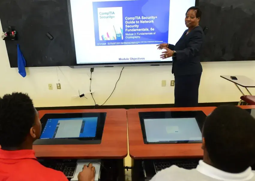 Demetria White, Tougaloo College's director of Academic Computing and assistant professor of Mathematics, discusses cryptography with students Noel Ricks (left) and Aeries Hoskins, at the cyber security clinic on campus, Thursday, Oct. 17, 2024. Credit: Vickie D. King/Mississippi Today