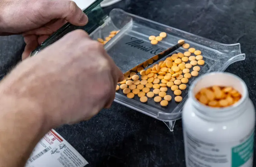 Pharmacy technician Drew Luckett processes a prescription at Brandon Discount Drugs in Brandon, Miss., on Thursday, Oct. 3, 2024. Independent pharmacies are facing financial challenges due to reduced reimbursements from the companies that serve as middlemen between pharmacies, drug manufacturers and insurers. Credit: Eric Shelton/Mississippi Today