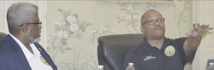 Mayor Ken Featherstone, right, tells Alderman Ruben Woods, left, that the public deserves to know the circumstances surrounding a late June deposit of a check amounting to $38,900 written by Spencer Construction to the city into one of the city’s bank accounts.