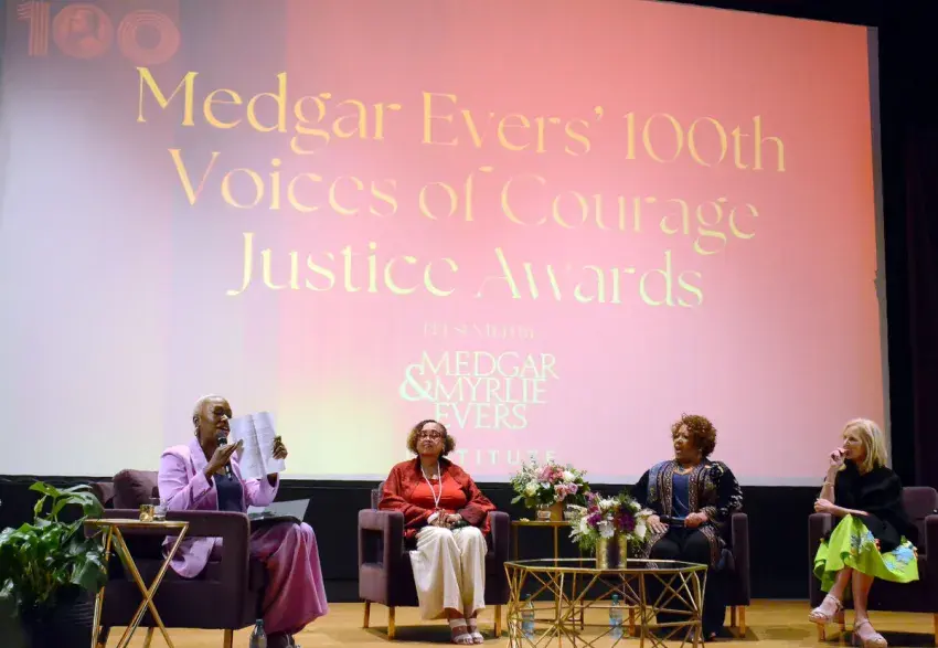 Mississippi Public Broadcasting Chief Operating Officer Anna Neel, left, and Chief Content Officer Taiwo Gaynor chat on set about Gaynor's Medgar Evers documentary at MPB headquarters, Friday, Aug. 1, 2025, in Jackson. Credit: Vickie D. King/Mississippi Today
