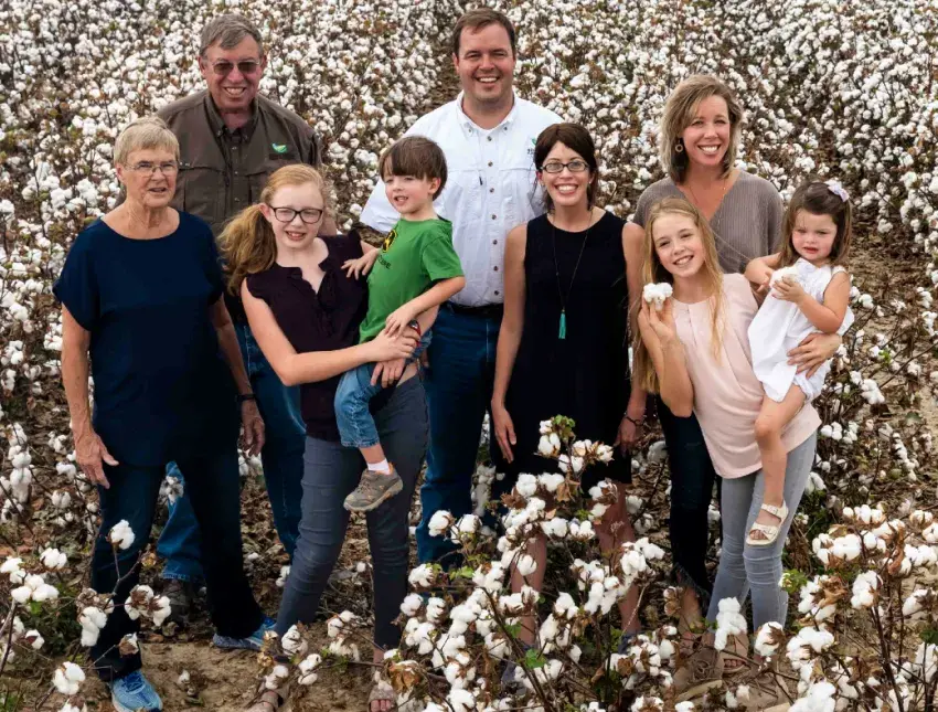 The Jack family, with strong ties to Sunflower County, now has three generations on the Silent Shade farm in Humphreys County, along with acreage in neighboring Holmes and Leflore counties. Pictured are Laura Lee Jack, Willard Jack, Audrey Koger holding Thomas Jack, Jeremy Jack, Elizabeth Jack, Emma Grace Koger, Ellie Jack and Stacie Koger (back right).