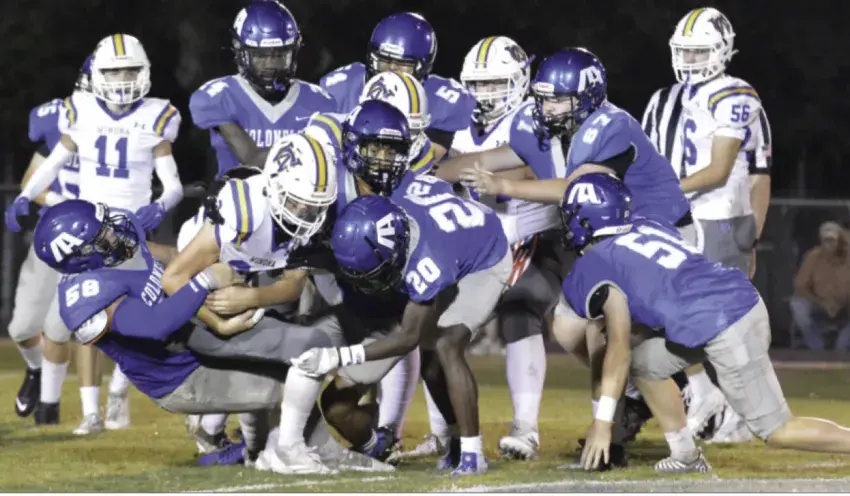 Blayne Fleming (No. 58), Khylon Pearson (No. 24), Michael Guillen (No. 54), Isaiah Morgan (No. 28), Ryan Cooperwood (No. 20), Cole Jobe (No. 67) and Nichols McCrory (No. 51) are all in on this stop of a Winona Christian ball carrier during last Friday night’s home loss to the Stars. Photo by Bryan Davis