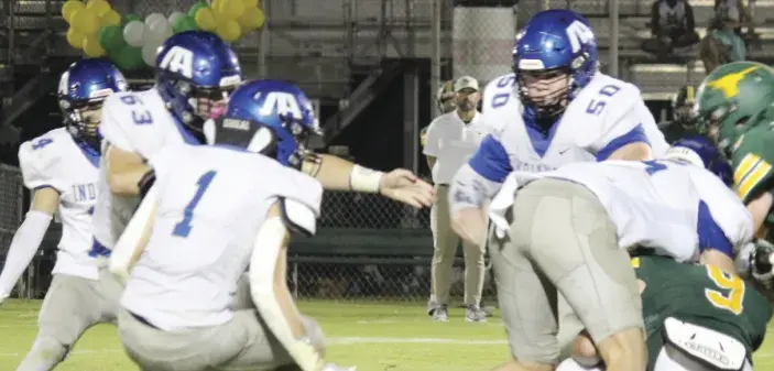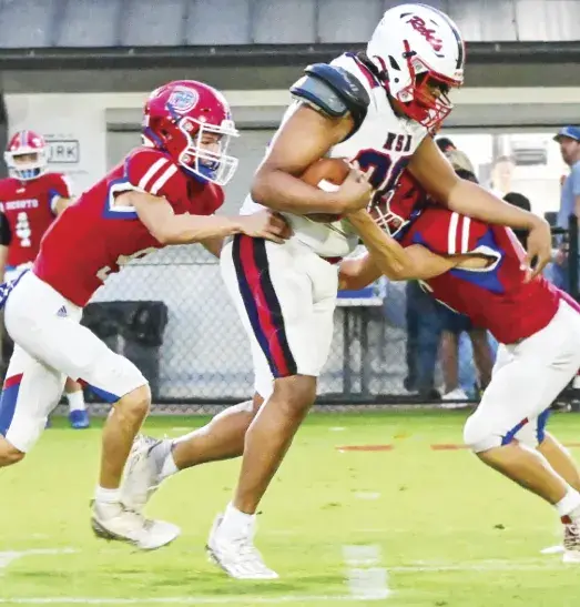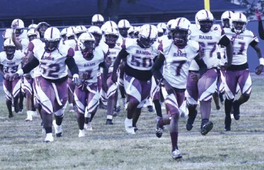 Pictured left, North Sunflower Academy’s Poohnuk Williams drives the ball for the Rebels during the game against DeSoto School. Right, team captains Wyatt Barr, Lake Clem and Poohnuk Williams head to the coin toss before the game.