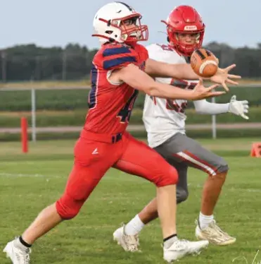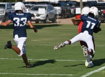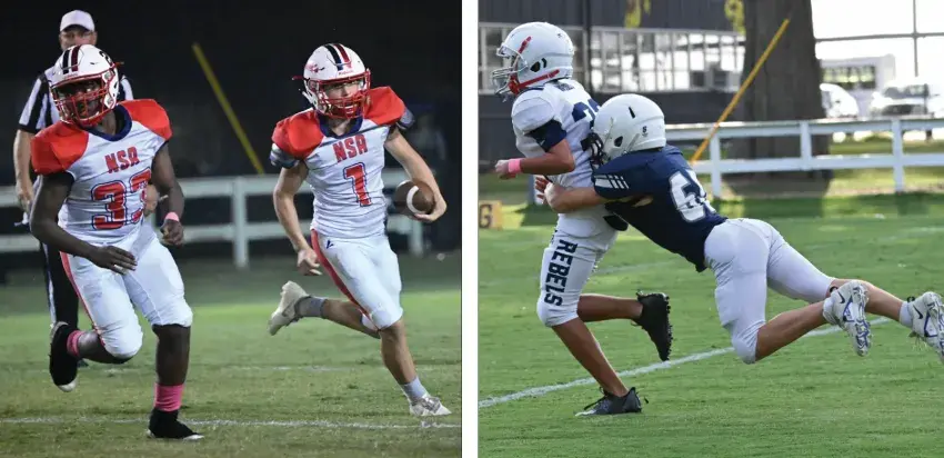 Pictured above to the left, North Sunflower Academy’s Jorden Madden blocks for Maddox Milum during an offensive play against Tunica. The JV Rebels won the game 44-20. To the right, a Tunica player hangs on for the ride as Kaleb Woods makes a Rebel score during a recent peewee game.