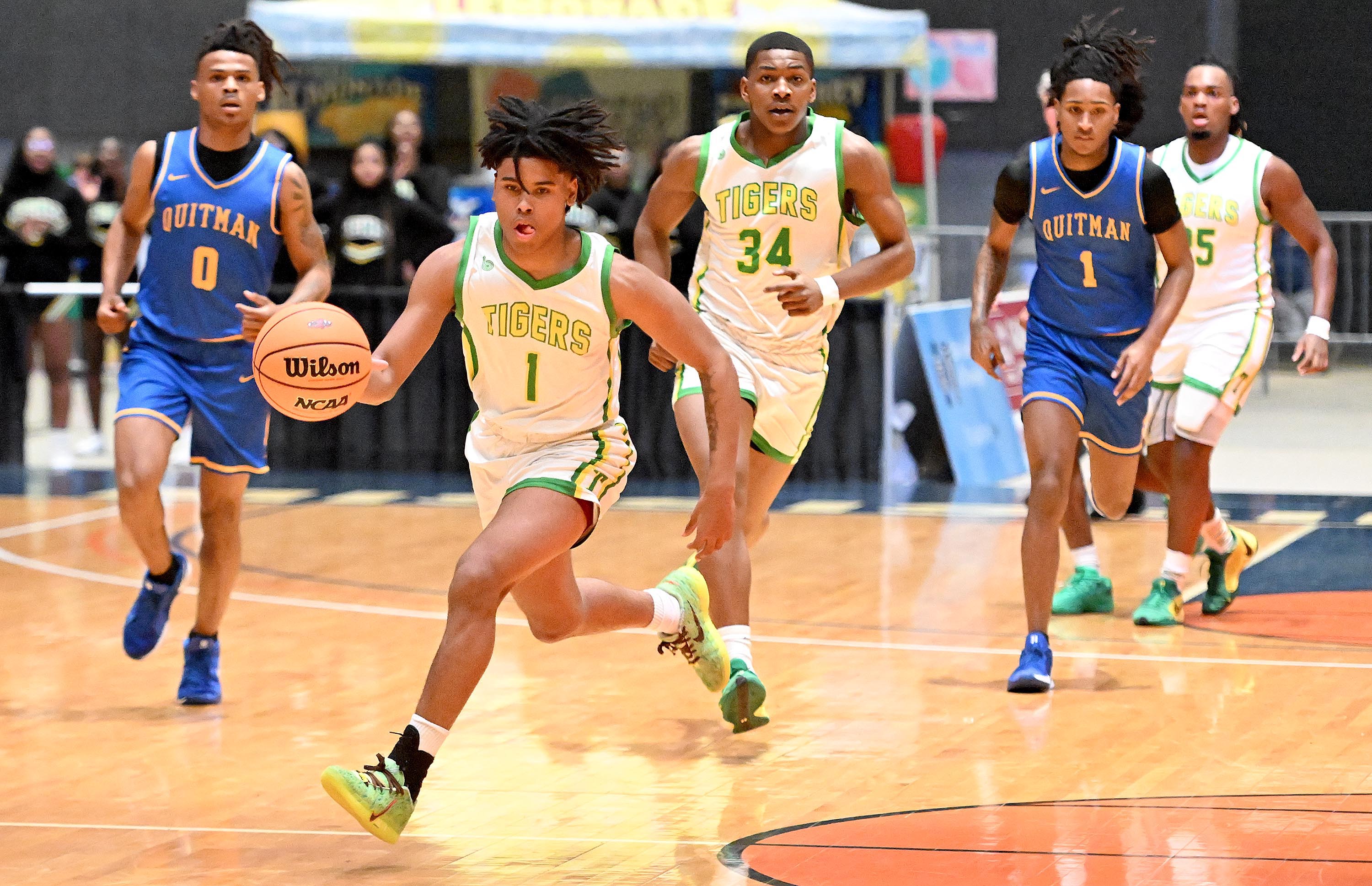 The Tigers started the game with a full-court press on defense, and the Panthers responded by keeping both teams' offenses at bay. The Tigers scored five points — all from free throws — in the first quarter, while Quitman had one field goal and three free throws, tying the score at 5-5.