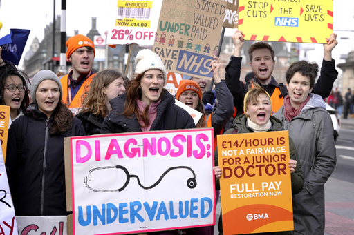 LONDON (AP) — Tens of thousands of junior doctors went on strike across England on Monday to demand better pay, kicking off three days of widespread disruption at the U.K.'s state-funded hospitals and health clinics.