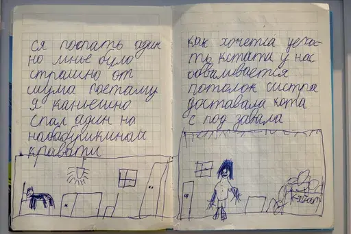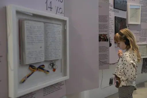 The youngest diarist, 10-year-old Yehor Kravtsov, also lived in besieged Mariupol. In text on display next to his diary, he writes that he used to dream of becoming a builder. But his experience living through the city's siege changed his mind.