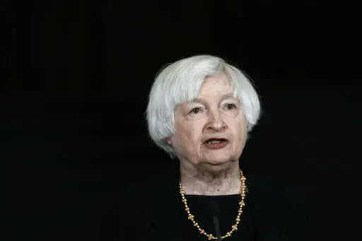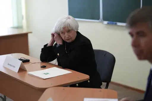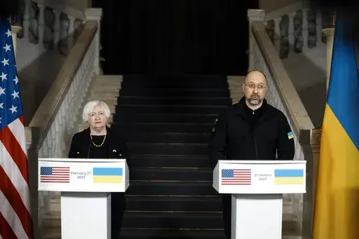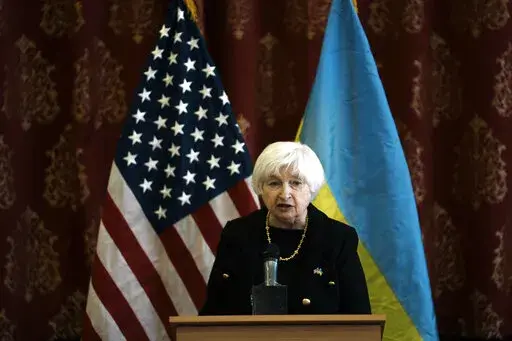 KYIV, Ukraine (AP) — U.S. Treasury Secretary Janet Yellen said Monday her first visit to Ukraine underscored Washington's commitment to continuing its economic support for the country, as the din of air raid sirens echoed across the Ukrainian capital.